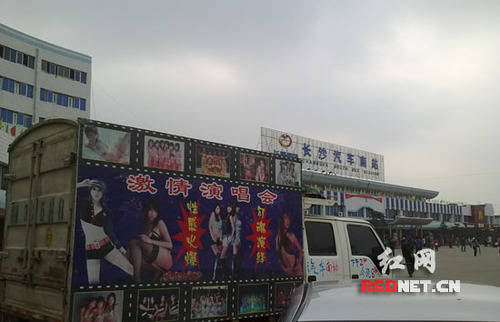 ????紅網(wǎng)長(zhǎng)沙12月27日訊(記者 李衛(wèi)林)“激情無(wú)限,魅力四射”“實(shí)力+風(fēng)騷+搞笑”“100%好看”……在客流量巨大的長(zhǎng)沙汽車南站前坪,經(jīng)常停著一臺(tái)印有香艷宣傳畫、帶有高音喇叭的流動(dòng)宣傳車,刺激四方乘客眼球。昨日,來(lái)自湘潭的王先生把這一畫面用手機(jī)拍了下來(lái),曬在紅網(wǎng)《百姓呼聲》欄目。