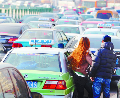 ????1月4日下午2時許,在膠州路上,由于這里交通擁堵,兩名乘坐出租車的市民未到目的地,選擇提前下車,從密集的車流中離開堵車現(xiàn)場。