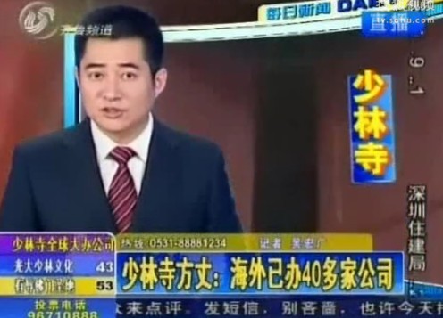 該報道稱,在北京大學(xué)文化產(chǎn)業(yè)研究院舉行的“第八屆文化產(chǎn)業(yè)新年論壇”上發(fā)表演講時,嵩山少林寺方丈釋永信透露目前少林寺在柏林、倫敦等地直接辦了40多家公司,另外還間接辦了一些公司。他同時表示希望資金充裕時能在海外買地建房。