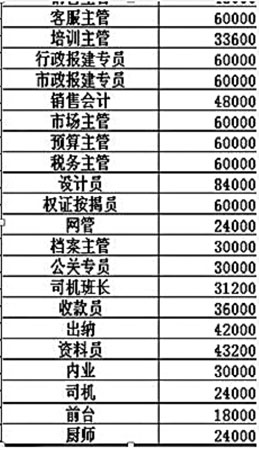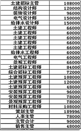這份工資單中,年薪最高的為總經(jīng)理,549996元;年薪最低的為前臺(tái),1.8萬元。年薪在40萬以上的包括總經(jīng)理、財(cái)務(wù)總監(jiān)、開發(fā)副總等6人,年薪在20萬~40萬的包括成本總監(jiān)、研發(fā)副總監(jiān)在內(nèi)的共5人,年薪在10萬~20萬的包括開發(fā)部經(jīng)理、建筑設(shè)計(jì)師等20人,其余的年薪均在10萬以下,以6萬元居多。