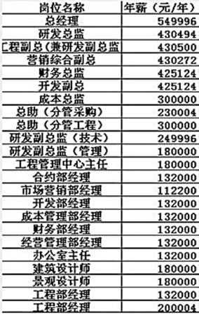 昨日,網(wǎng)絡(luò)上出現(xiàn)一則關(guān)于重慶房地產(chǎn)從業(yè)人員工資待遇的帖子,發(fā)帖者“好時(shí)光11”在帖中貼出了一份“重慶某開發(fā)商的詳細(xì)工資表”,當(dāng)中以年薪計(jì)算,共涉及70人,從公司總經(jīng)理、研發(fā)總監(jiān)到前臺(tái)、廚師,每個(gè)人的年薪都一目了然,其中年薪最高的為總經(jīng)理,549996元。昨日,我市某大型房地產(chǎn)開發(fā)商表示,這份工資表內(nèi)容基本屬實(shí),實(shí)際上,重慶部分房產(chǎn)商總經(jīng)理年薪可達(dá)300萬。