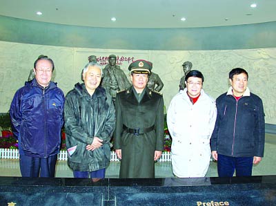 ????新四軍“將二代”在父輩青銅雕像前合影。左起:鄧淮生、陳曉魯、劉源、張光東、賴小鵬。