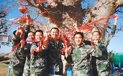 ????蘇丹達(dá)爾富爾聯(lián)合國超級營地處于一片不毛之地,唯有中國營區(qū)內(nèi)有兩棵參天的百年大樹,官兵們分別稱之為“常樂樹”和“常青樹”。春節(jié)來臨,中國第四批赴蘇丹達(dá)爾富爾維和大隊(duì)官兵按照慣例來到樹下,在晨風(fēng)中,系上了寄托子弟兵思念的紅綢帶(見上圖,本報(bào)記者吳文斌攝)。