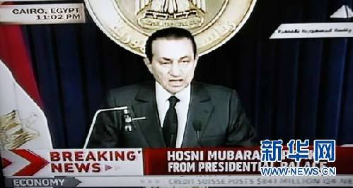 這張2月10日拍攝的電視截圖顯示,埃及總統(tǒng)穆巴拉克發(fā)表電視講話。埃及總統(tǒng)穆巴拉克當(dāng)晚發(fā)表電視講話宣布將部分權(quán)力移交給副總統(tǒng)蘇萊曼(新華社 發(fā))