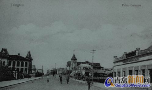![]() 德占初期的中山路南段,右側(cè)的平房就是最早的膠州旅館,兩個(gè)帶塔樓的建筑是貝格學(xué)生公寓(建于1899年)和水師飯店(建于1900年),照片拍攝于20世紀(jì)初。
