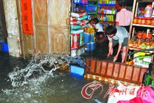 河源市區(qū),雨水漫進(jìn)店內(nèi),店主奮力“抗洪”。記者曾煥陽 攝