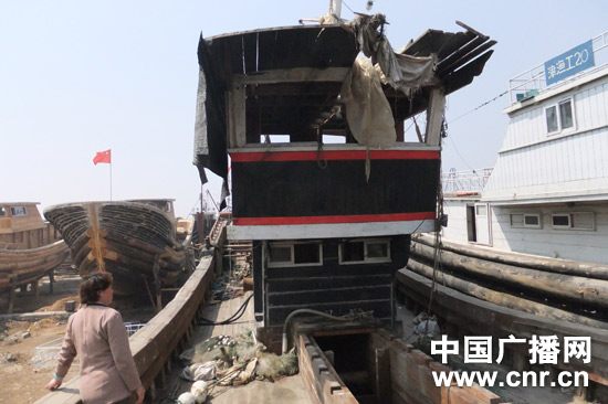 漁船冀昌漁5056號(hào)左側(cè)船舷全部被撞壞(中國(guó)之聲記者陳俊杰/攝)