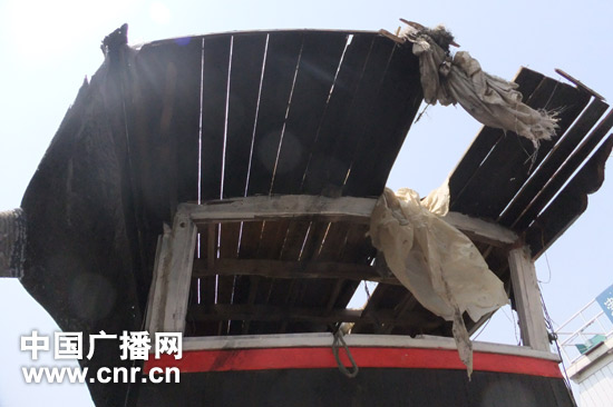 被撞的漁船冀昌漁5056號(hào)殘破的船頂(中國(guó)之聲記者陳俊杰/攝)