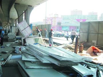 ????昨天上午,施工人員首先拆除了橋下兩側(cè)的圍擋及部分容易拆裝的活動板房,兩側(cè)的圍擋拆除后,橋下立馬顯得格外敞亮。執(zhí)法人員告訴記者,橋下共有56家經(jīng)營業(yè)戶,經(jīng)營范圍包括了洗車美容、汽車修理、鐵藝及塑鋼加工、五金土產(chǎn)、稱重等,自半個多月前,他們已經(jīng)向承包人發(fā)出了整治通知,之后又挨家挨戶通知了業(yè)主,張貼了通告,并將首次集中清理時間定在昨天,預(yù)計整個整治行動共分3次。對空地清理后的用途,執(zhí)法人員表示,最終方案還沒有確定,但首選仍是在硬化、綠化后,重新建設(shè)停車場,解決周邊停車難題。