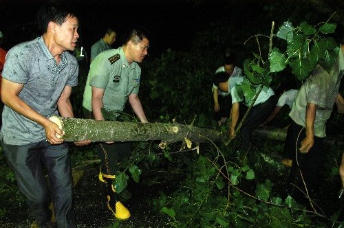6月24日晚,救援人員將傾倒在嵩縣縣城公路上的樹木移開。