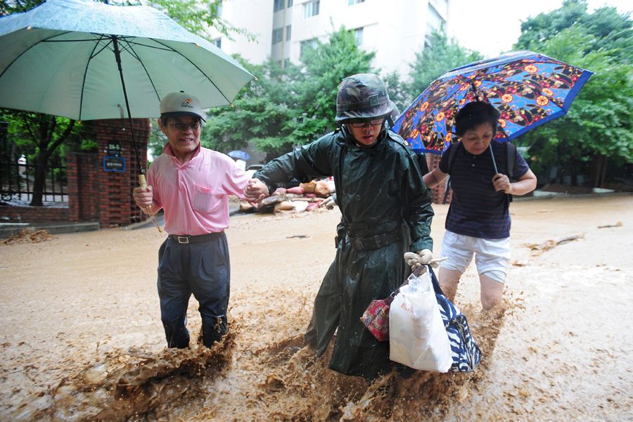 圖為當?shù)貢r間7月27日,韓國首爾遭到暴雨襲擊,城市街道被淹,部分地區(qū)引發(fā)泥石流災害。