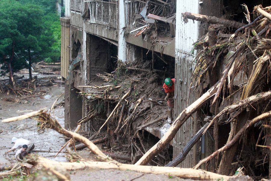 圖為一棟被沖毀的居民樓。當?shù)貢r間7月27日,韓國首爾遭到暴雨襲擊,城市街道被淹,部分地區(qū)引發(fā)泥石流災害。