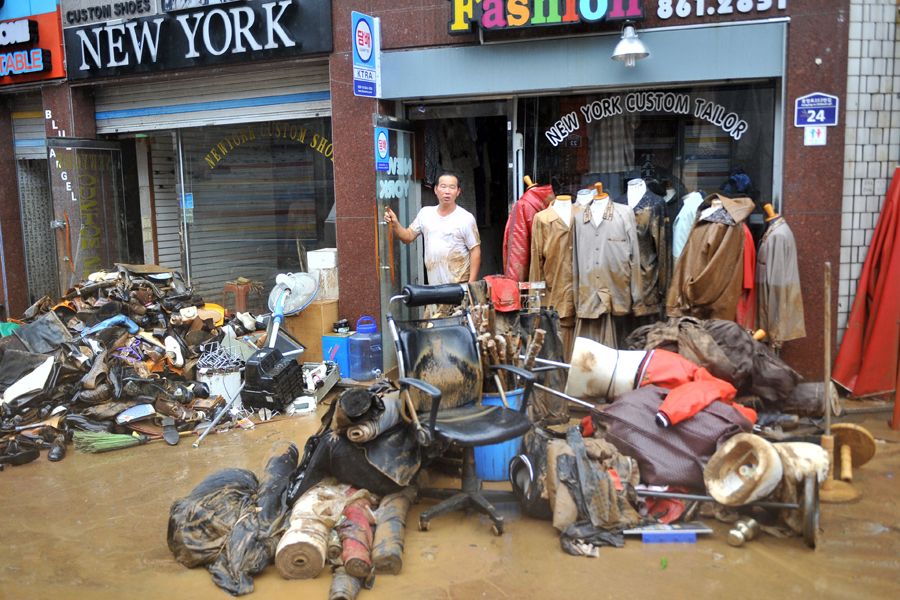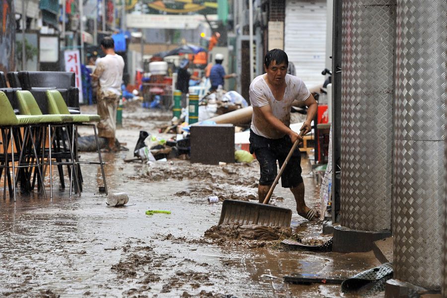 法新社28日稱,數(shù)以萬(wàn)計(jì)韓國(guó)軍隊(duì)投入救災(zāi)工作,特大災(zāi)情讓韓國(guó)民眾非常不安。彭博社稱,目前約 4600人流離失所,恐慌情緒在蔓延。圖為災(zāi)后首爾展開(kāi)清理工作。