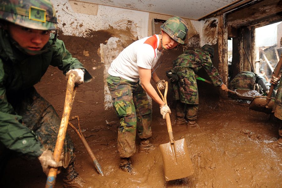 韓國(guó)《中央日?qǐng)?bào)》28日稱,遭遇泥石流的牛眠山居民怨聲載道,指責(zé)政府拖沓山上工程的工期致泥土堆積,之前提意見(jiàn)督促雨季前完工,政府不予理睬,直至慘禍發(fā)生。圖為災(zāi)后展開(kāi)清理工作。