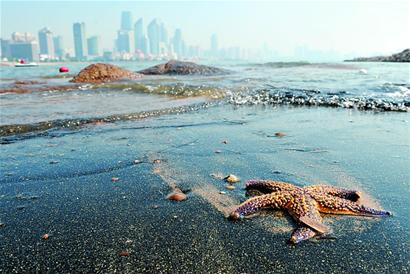 9月6日,在青島第三海水浴場,一只海星被海浪沖上沙灘。(新華社照片)
