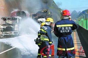????記者隨后從韶關(guān)交警京珠北大隊獲悉,昨天上午8時59分,警方接到群眾報警稱:京港澳高速南行1892公里的云巖長下坡路段,有一輛拉蔬菜的貨車與一輛高?;瘜W(xué)品運輸車發(fā)生碰撞,化學(xué)品運輸車內(nèi)裝有30噸的甲醇被撞后泄漏燃燒。由于火勢猛烈,現(xiàn)場車輛不敢通過,南北行交通中斷,現(xiàn)場極有可能發(fā)生大爆炸,情況危急萬分。