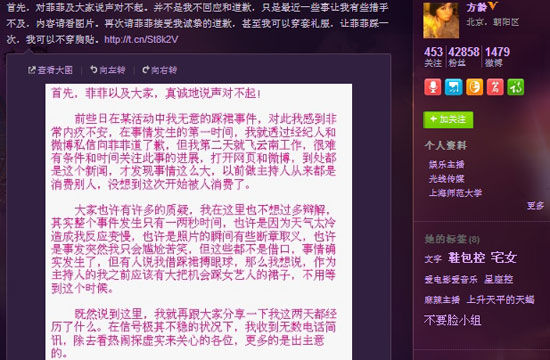 方齡在其發(fā)布的長(zhǎng)篇文字中寫道自己在事發(fā)的第一時(shí)間就透過經(jīng)紀(jì)人以及微博私信向?qū)O菲菲道歉了,后就飛往云南工作了。方齡解釋自己并非故意踩孫菲菲的裙子,“作為主持人的我之前應(yīng)該有大把機(jī)會(huì)踩女藝人的裙子,不用等到這個(gè)時(shí)候。”方齡表示自己之所以沒有馬上公開道歉是因?yàn)檫@幾天經(jīng)歷了危機(jī)公關(guān)轟炸式的灌輸,所以會(huì)反應(yīng)有些遲鈍。
