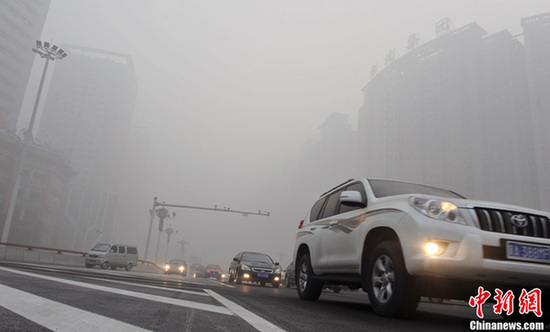 1月10日8時許,河北省發(fā)布大霧紅色預(yù)警,唐山南部、廊坊、保定、石家莊、滄州、衡水、邢臺、邯鄲有大霧天氣,部分地區(qū)能見度小于50米。圖為石家莊市區(qū)主干路能見度在50米左右,車輛緩慢行進。中新社發(fā)翟羽佳 攝
