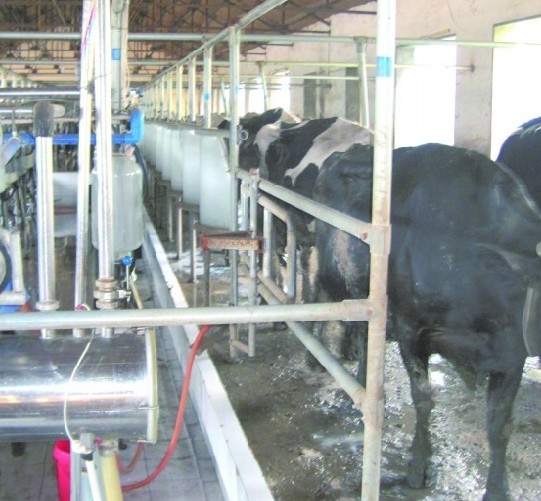 一鮮奶吧的奶源牧場(chǎng),奶牛正在通過簡(jiǎn)陋的機(jī)器擠奶。(記者 劉延珉 攝)