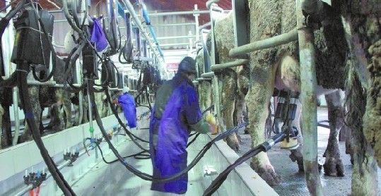 光明開開加牧場(chǎng),全自動(dòng)化的機(jī)器設(shè)備在車間給奶牛擠奶。