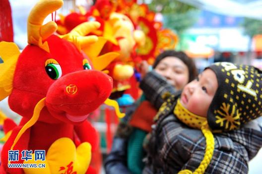 1月18日,在湖北襄陽(yáng)保康縣城,一對(duì)母子在選購(gòu)“龍”形象的新年飾品。新華社發(fā)(楊韜 攝)