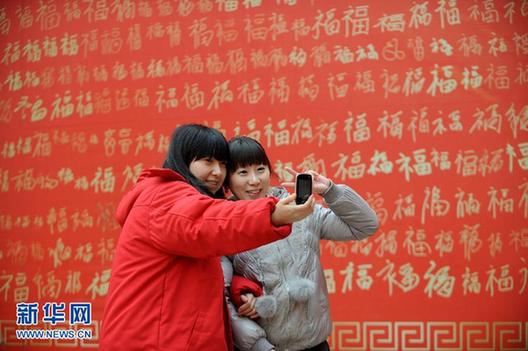 1月18日,兩位沈陽市民在沈陽市多福小區(qū)“迎福墻”前合影。 新華社發(fā)(張文魁 攝)