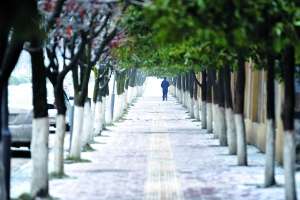 ????1月25日,一位行人從貴州開陽縣的林蔭路經(jīng)過。持續(xù)的低溫雨雪天氣,已使貴州開陽縣的道路上鋪了一層薄冰。當日,貴州59縣市區(qū)出現(xiàn)凍雨(小雪)和電線積冰,71縣市區(qū)最低氣溫在0攝氏度以下。