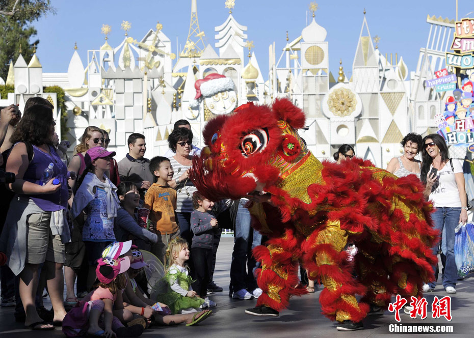 當(dāng)?shù)貢r間1月25日(中國農(nóng)歷新年初三),加州迪斯尼樂園的舞獅表演吸引游客。當(dāng)日,加州迪斯尼樂園充滿中國元素,來自中國北京等地的近千名游客在這里歡度中國農(nóng)歷龍年。中新社記者毛建軍 攝