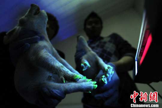 ![]() 豬蹄發(fā)綠光的“熒光豬”(中新社發(fā) 任東 攝) 中新社昆明2月3日電 云南農(nóng)業(yè)大學(xué)動(dòng)物科學(xué)技術(shù)學(xué)院近日成功育成10頭攜帶綠色熒光蛋白和瘦素蛋白的轉(zhuǎn)基因克隆豬引起各界廣泛關(guān)注,2月3日記者在云南農(nóng)業(yè)大學(xué)了解到,這一成果將有助于脂肪沉積以及人類肥胖病和糖尿病等疾病的研究,也將使轉(zhuǎn)基因克隆技術(shù)在功能基因驗(yàn)證、疾病模型、異種器官移植等領(lǐng)域的應(yīng)用前景更為廣闊。 踏進(jìn)云南農(nóng)業(yè)大學(xué)動(dòng)物科學(xué)技術(shù)學(xué)院實(shí)驗(yàn)區(qū),記者看到,兩間豬圈、一排平房、一小塊草地就構(gòu)成了孕育這批“神奇”小豬的基地。在豬圈一角,兩個(gè)紅色暖房里一窩粉白色的新生小豬酣睡正香?!八鼈兙褪秦i蹄會(huì)發(fā)亮的小豬”,云南農(nóng)業(yè)大學(xué)動(dòng)物科學(xué)技術(shù)學(xué)院教授魏紅江告訴記者:“現(xiàn)在實(shí)驗(yàn)區(qū)共育出10頭這樣的小豬,它們分別在1月17日、26日、29日出生?!?/p> 據(jù)了解,這批“神奇”小豬都屬于轉(zhuǎn)基因克隆豬,都被轉(zhuǎn)入綠色熒光蛋白基因和Leptin蛋白基因。其中,綠色熒光蛋白可作為重要的標(biāo)識(shí)來追蹤轉(zhuǎn)入基因的表達(dá)情況,存活的轉(zhuǎn)基因克隆豬在紫外線照射下嘴唇、耳朵、四肢等部位可呈現(xiàn)出綠色熒光。 “給它們轉(zhuǎn)入綠色熒光基因?qū)嶋H上是做一個(gè)標(biāo)記,用來判斷Leptin蛋白基因是否轉(zhuǎn)入?!蔽杭t江解釋說。那么Leptin蛋白基因又有什么作用呢?“魏紅江說:Leptin又名瘦素、瘦蛋白抗肥胖因子、苗條素,是由肥胖基因編碼、脂肪細(xì)胞分泌的一種激素樣蛋白質(zhì),具有調(diào)節(jié)攝食行為、增加能量消耗、抑制脂肪合成、促進(jìn)脂肪分解和降低采食量的作用?!?/p> “這種轉(zhuǎn)基因克隆豬在生長(zhǎng)、繁殖、泌乳和生長(zhǎng)性能方面發(fā)生的改變,將可用于脂肪沉積以及人類肥胖病和糖尿病等疾病的研究?!?/p> 魏紅江說:“此項(xiàng)技術(shù)影響十分深遠(yuǎn)。我們可以建立更多的疾病動(dòng)物模型,除了肥胖癥和糖尿病,我們還可以植入老年癡呆癥、腫瘤等病癥的致病基因,然后在豬身上做實(shí)驗(yàn),從而幫助尋找預(yù)防和治療這種疾病的鑰匙。目前已經(jīng)明確人類許多疾病與基因有關(guān)。如果將導(dǎo)致疾病的基因都轉(zhuǎn)移到動(dòng)物身上,相當(dāng)于在研究人?!?顧一航) |