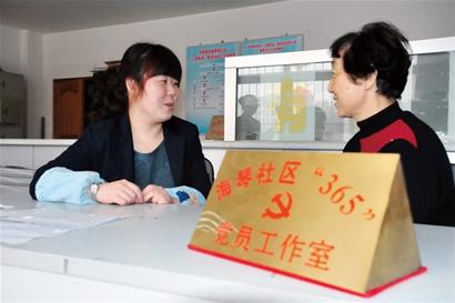 四方海琴社區(qū)居委會365黨員工作室的工作人員(左)在與社區(qū)居民談心(記者 于小陽 攝)