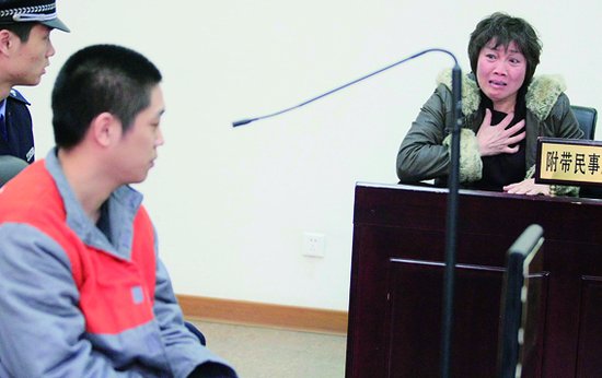死者張某的母親在法庭上痛斥被告人趙某 攝/記者曹博遠 ????22歲男子伙同兩人來到18歲女網(wǎng)友家中將其掐死受害者 母親法庭痛斥——你們太殘忍了還我女兒 ????為了要錢,22歲的趙某伙同梁某、付某來到女網(wǎng)友張某家中,將18歲的張某掐死。 ????今日上午,被控搶劫罪的趙某等3人在二中院受審,死者張某的母親要求趙某償命。 ????上午11時,趙某等3人被帶上法庭時神情輕松,見到坐在旁聽席上的家人,3人還笑著點頭示意。 可趙某還未走到被告人席上,死者張某的母親李女士突然站起身來,揮拳就打,邊打邊哭著喊:“你們太殘忍了,還我女兒,你們這些畜生!”但很快被法警制止。 “剛才不是說了要你們控制一下嗎,要不怎么開庭。”法官勸說李女士。“一看到他們,我就控制不住?!痹诶钆勘WC遵守法庭紀律后,法官宣布開庭。 2011年5月27日10時許,趙某伙同梁某、付某來到豐臺區(qū)張某家中,采用扼壓頸部、悶堵口鼻的方法,致18歲的張某死亡。 待張某母親李女士進入該房間后,趙某等3人對其持刀相威脅,搶得現(xiàn)金7000余元、銀行卡5張及移動電話3部等物品,并將李女士打成輕傷。 據(jù)李女士講,平時她都是中午才回家,事發(fā)當天,她剛剛打開家門,就被3個人按倒在地,“他們把我綁到臥室,管我要錢,我說沒錢,他們就打我、掐我,說不給錢就打死我?!崩钆靠拗f不下去了,稍微平靜后,李女士說她一直都不知道女兒已經(jīng)被掐死了,“我女兒死得好慘,我就是要他們償命”。 “梁某說他父親病了,要錢看病,我也欠人錢,所以就商量著弄點錢花?!壁w某說,5月中旬,梁某跟他商量弄錢一起干票大的,本來說好要搶一個姓芮的男子,綁了后向他家里要錢,如果不給,就殺了芮某。沒想到芮某沒有來。 事發(fā)前,他們買了手銬、帽子和眼鏡,還從梁某家里拿了把刀。 截止發(fā)稿時庭審仍在進行中。 |