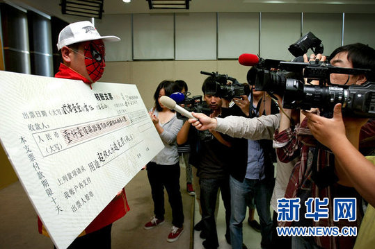 2011年5月30日,成都,帶著蜘蛛俠面具的南充彩民在四川體彩中心領(lǐng)取超級(jí)大樂透11769493元(稅后)獎(jiǎng)金并接受記者采訪。5月28日晚開出的彩票超級(jí)大樂透第11061期南充一彩民憑借追加一元錢獲獎(jiǎng)1471萬元,成為四川體彩史上第11位千萬大獎(jiǎng)得主。