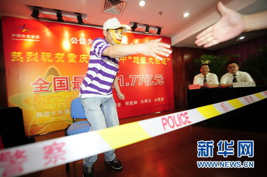 2011年7月5日,1.769億體彩大樂透大獎得主現(xiàn)身重慶市體彩中心領(lǐng)走大獎,并捐款500萬元。大獎得主戴著孫悟空面具領(lǐng)獎。