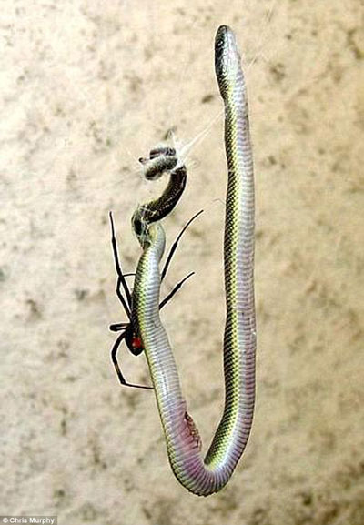 蜘蛛輕松的將這條14厘米長(zhǎng)的蛇作為美味大餐 【搜狐科學(xué)消息】據(jù)國(guó)外媒體報(bào)道,如果天生患有“蜘蛛恐懼癥”的人們聽到這個(gè)消息,相信一定會(huì)將南非視為噩夢(mèng)般的地域了。據(jù)國(guó)外媒體報(bào)道,南非某公司的一位工作人員,在其辦公桌旁瞥見了驚人一幕:即一只蜘蛛將一條14厘米長(zhǎng)的家蛇當(dāng)做早餐狼吞虎咽的吞掉。據(jù)這位目擊者表示,這只蜘蛛為這場(chǎng)“謀殺”已經(jīng)精心籌備了兩天之久,這片蜘蛛網(wǎng)就是它花了兩天時(shí)間“編織”而成的。 據(jù)了解,這位目擊者名為塔尼爾—羅伯特遜(Tania Robertson),她是南非一家電力公司的職員,這個(gè)場(chǎng)景讓她感到十分震驚。她說(shuō)道,那天她去公司上班時(shí),無(wú)意瞥向辦公桌,就看到了這驚人場(chǎng)景。當(dāng)時(shí)她完全被現(xiàn)場(chǎng)震驚了,因?yàn)樗€是第一次眼睜睜的看見蜘蛛一口口的將蛇吃掉。而且,最為不可思議的是,這條14cm長(zhǎng)的蛇牢牢的被蜘蛛網(wǎng)所纏住,無(wú)絲毫反抗之力的懸在了半空中。沒過(guò)多久,這只蜘蛛就狼吞虎咽的將這條蛇全部消滅干凈,或許這是它這一天的一頓大餐了。羅伯特遜還表示,這只蜘蛛似乎早早就開始進(jìn)行這次“謀殺”的籌備工作了,因?yàn)閮商烨八烷_始就在一個(gè)離地面較高的地方織網(wǎng),在這期間還有不少小的獵物被粘在網(wǎng)上,成為它的小點(diǎn)心。甚至在某一時(shí)刻,這只蜘蛛對(duì)意外落在網(wǎng)上的蒼蠅都會(huì)帶有很強(qiáng)的攻擊反映,只要蜘蛛發(fā)現(xiàn)了無(wú)意中落入“圈套”的獵物,就會(huì)毫不留情的將它們?nèi)肯麥绲簟?/p>