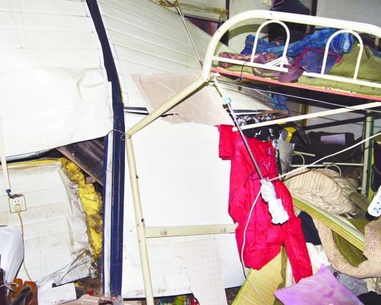 ![]() 被撞壞的宿舍內(nèi)部。 ????3月18日凌晨3時(shí)許,一輛黑色豐田轎車撞穿路邊地鐵工地的隔離鐵板沖進(jìn)工人宿舍,一名工人從上鋪摔下受傷,所幸傷勢不重。 ????“這個(gè)車直接撞進(jìn)我們宿舍里來了,我們都沒反應(yīng)過來?!?月18日凌晨3時(shí)許,一輛在江西路上自西向東行駛的黑色豐田轎車突然失控,一頭撞進(jìn)路邊一處地鐵工地宿舍內(nèi)。凌晨3時(shí)20分許,記者來到事發(fā)現(xiàn)場,看到這輛黑色轎車的大半車體已經(jīng)扎進(jìn)工地內(nèi)部工人的板房宿舍中,七八名衣衫不整的地鐵工人正圍著轎車討論,而三名交警正在現(xiàn)場維持秩序。在工地內(nèi)部,記者看到工人的板房宿舍共有兩層,其中一樓最西處一間房屋因?yàn)槠嚨淖矒粢呀?jīng)嚴(yán)重變形無法進(jìn)入,而通向二樓的戶外樓梯也被撞斷。 ????回憶起事發(fā)的過程,一名工人告訴記者:“就跟地震一樣,我什么都不知道就從床上摔下來了?!彼f當(dāng)時(shí)大家正睡得香,汽車突然沖進(jìn)來,他們根本不可能做出反應(yīng),直接就從床上掉了下來?!拔乙粋€(gè)工友已經(jīng)被送到醫(yī)院了,他是從上鋪摔下來的?!彼€告訴記者,他們辦公用的電腦、對講機(jī)也被撞壞了。 ????“我們也不知道司機(jī)去哪了?!眴柕秸厥滤緳C(jī)的去向,工人們告訴記者,汽車剛撞進(jìn)來不久,司機(jī)就從車后門離開現(xiàn)場了。記者看到事故中汽車的損傷較重,車頭保險(xiǎn)杠已經(jīng)脫落,但車內(nèi)的安全氣囊并沒有打開,由于汽車被卡住,兩側(cè)的前車門都已經(jīng)無法打開,交警只能從汽車后門進(jìn)入車內(nèi)查看情況。目睹整個(gè)事故發(fā)生過程的葉先生告訴記者,他當(dāng)時(shí)看到這輛汽車不知什么原因直接扎進(jìn)地鐵工地宿舍內(nèi),不久就有一名男子從汽車后門下車,離開了現(xiàn)場。而其他幾名工人則告訴記者,當(dāng)時(shí)車上可能有兩個(gè)人,但他們并不知道這兩人的去向。 ????“司機(jī)去醫(yī)院了,我們一會(huì)要去調(diào)查?!爆F(xiàn)場一位交警告訴記者,現(xiàn)在無法鑒定事故原因。凌晨4時(shí)許,交警試圖將汽車從工地里拖出,無奈由于車體卡得太緊幾次嘗試都沒有成功,直到清晨6時(shí)許汽車才被拖出。(記者 孫英男) |