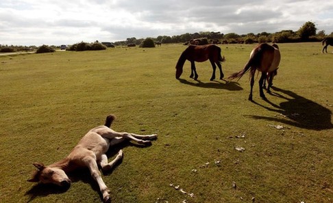 2009年5月31日,英國多塞特,野馬群中的小野馬在烈日下躺著不愿起來