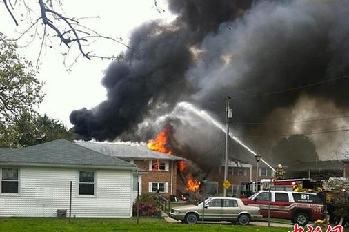 4月6日,美國海軍一架FA-18D “超級大黃蜂”戰(zhàn)機突然撞進弗吉尼亞州一處旅游勝地的民宅,令當(dāng)?shù)鼐用裨庥觥帮w來橫禍”,事故至少造成七人受傷。圖為被撞居民區(qū)燃起熊熊大火,并籠罩在滾滾濃煙之中。