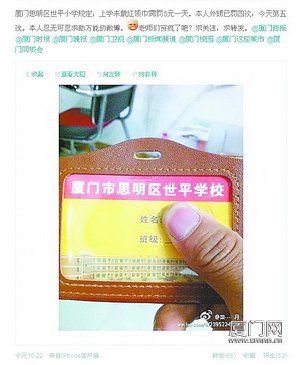 發(fā)在微博上的??ā?/p> ????“上學(xué)未戴紅領(lǐng)巾需罰5元一天”,昨日上午10點(diǎn)22分,網(wǎng)友“柒-----月”在微博上說(shuō),這是思明區(qū)世平小學(xué)的規(guī)定,其外甥已經(jīng)被罰4次,昨天是第5次。 ????記者發(fā)現(xiàn),該網(wǎng)友將內(nèi)容轉(zhuǎn)發(fā)給廈門(mén)多家媒體,同時(shí)上傳了“廈門(mén)市思明區(qū)世平學(xué)?!钡男??,但是卡上的姓名以及班級(jí)等內(nèi)容被遮擋,這條微博上也沒(méi)有明確指出是學(xué)校哪個(gè)年段班級(jí)以及哪位老師所為。 ????昨日中午,記 ????昨日下午2點(diǎn)左右,記者在思明區(qū)蓮花五村龍山南路找到了這所學(xué)校。記者了解到,這是一所民辦學(xué)校,除了小學(xué),還有中學(xué),學(xué)生人數(shù)將近2000。 ????此時(shí),學(xué)校還未上課。記者在校門(mén)口詢(xún)問(wèn)了幾位2年級(jí)、5年級(jí)的學(xué)生,這些學(xué)生均表示沒(méi)有聽(tīng)說(shuō)這件事?!安淮骷t領(lǐng)巾要被扣分,但是不會(huì)罰錢(qián)?!币幻?年級(jí)的女同學(xué)這樣告訴記者。 ????這種事情會(huì)不會(huì)發(fā)生在個(gè)別班級(jí)呢?記者隨即找到了“世平學(xué)校”的楊校長(zhǎng)。 ????在辦公室里,楊校長(zhǎng)說(shuō):“我們一直都在和老師強(qiáng)調(diào),任何涉及收費(fèi)的事情,都要向?qū)W校匯報(bào),更不要說(shuō)是罰款了”。 ????該校的董事長(zhǎng)黃先生同意立即對(duì)所有戴紅領(lǐng)巾的班級(jí)進(jìn)行查詢(xún),包括2年級(jí)到6年級(jí)的總共18個(gè)班級(jí)。黃先生指派趙老師陪同,記者對(duì)這些班級(jí)的班長(zhǎng)進(jìn)行了簡(jiǎn)短詢(xún)問(wèn),18名班長(zhǎng)都明確表示,他們班上沒(méi)有發(fā)生過(guò)這種事。 ????校方推測(cè),也有可能存在兩種情況:一種是某個(gè)班級(jí)老師說(shuō)氣話(huà),拿“罰款”來(lái)嚇唬嚇唬孩子,另一種則是這個(gè)孩子撒謊,為了向家長(zhǎng)索要零花錢(qián),謊稱(chēng)老師要罰款。目前,這兩種說(shuō)法都沒(méi)有得到證實(shí)。 ????就在記者和校方基本上排除發(fā)生此事的可能性后,網(wǎng)友“柒-----月”又在昨日傍晚發(fā)了后續(xù)微博,指明是該學(xué)校劉姓女教師所為,“經(jīng)確定,本人外甥已交兩元,其余欠賬!求曝光!” ????記者又將該信息反饋給“世平學(xué)校”的黃董事長(zhǎng),對(duì)方表示會(huì)對(duì)此事做進(jìn)一步調(diào)查。本報(bào)也將繼續(xù)關(guān)注此事。(記者 汪長(zhǎng)福) |