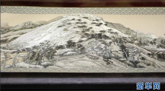 這是民間國寶當(dāng)代“蘇繡《富春山居圖》局部(4月29日攝)。 4月29日,由中國民間國寶專家評審委員會和《收藏界》雜志社主辦的第三屆中國民間國寶評審揭曉典禮在北京舉行。歷時(shí)兩年,足跡遍布大江南北、塞外高原、港臺等地區(qū)的民間尋寶活動(dòng)暫告段落。唐代玉瑞獸、蘇繡《富春山居圖》、銅鎏金飛龍、五瑞圖鎏金銀神器、紅山文化玉龍等5件民間國寶,經(jīng)過嚴(yán)格評審,被授予“中國民間國寶”稱號。