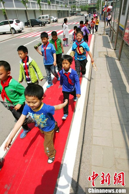 2012年5月2日,山東省濰坊市勝利東小學的學生放學走在“學生專用通道”上。為保障學生出行安全,日前,山東省濰坊市交警部門在這所學校門前設置了一條長約100多米的彩色“學生專用通道”,各類車輛都不得占用該通道,阻礙學生上下學通行,以保證學生出行安全。