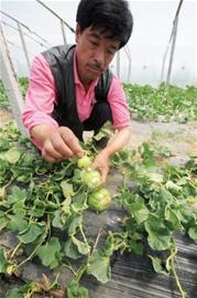 辛辛苦苦種出的甜瓜,一個個竟然長得奇形怪狀,瓜農的心真是傷透了。昨天上午,萊西市馬連莊鎮(zhèn)崔格莊和仲格莊兩村的數(shù)名村民向記者反映,共有7戶40多畝大棚甜瓜,使用了當?shù)厣a的有機化肥后,甜瓜苗半死不活,有的長出了怪狀,還裂了大口子。本來一個月的成熟期,如今兩個月了還不熟。瓜農懷疑他們買到了假化肥。隨后,記者將情況反映給了萊西農業(yè)局,相關負責人稱,他們將盡快成立專家組,近日趕往現(xiàn)場調查造成甜瓜變形的原因。 40多畝甜瓜幾近絕產 昨天,記者驅車一百多公里來到萊西市馬連莊鎮(zhèn)崔格莊村,瓜農李利剛一臉愁容地告訴記者,今年春節(jié)過后,他種了兩個大棚共6畝多甜瓜,去年冬天花1000多元買了10多袋有機化肥并施用。等瓜苗出來后卻發(fā)現(xiàn)出現(xiàn)了卷葉等情況,開始他覺得是瓜種不好,就換了種子又重新育了一次苗,可是過了一個月,讓他擔心的問題還是發(fā)生了。 “本來這大棚甜瓜一個月就成熟上市了,可今年種的瓜到了成熟期就是不熟,許多瓜還長不大,有的裂了口子,更嚇人的是有許多瓜竟然長得奇形怪狀?!崩罾麆偢嬖V記者,他種了10多年甜瓜,還是頭一次遇到這種情況,同村和鄰村的7戶瓜農的40多畝甜瓜都出現(xiàn)了這種情況,有一家3畝甜瓜竟沒開花結果。 “怪狀”甜瓜一直不熟 記者在李利剛等瓜農的帶領下,來到了崔格莊村南側的一片甜瓜棚里,表面上看這些綠油油的甜瓜苗沒有什么異樣,但靠近仔細一看,瓜秧的葉子有許多都是翻卷著的,像是枯了但又沒有死。再看結出的甜瓜,有的像雞蛋大小,大一點的看上去不像是甜瓜,形狀長成了多角形,有的瓜上冒出一個大疙瘩,有的出現(xiàn)了大裂口。 瓜農王進高說,這些瓜在一個月前就應該收獲了,可到現(xiàn)在一直不成熟,就是個別的瓜熟了,但長得奇形怪狀,拿到市場上也沒人要。記者在甜瓜大棚里轉了一圈發(fā)現(xiàn),7戶瓜農的甜瓜基本是同一種情況。 假化肥造成甜瓜變形 李利剛告訴記者,他發(fā)現(xiàn)問題后,就懷疑在馬連莊鎮(zhèn)一家農資站購買的有機化肥存在問題。李利剛說,出現(xiàn)問題的7戶瓜農用的是同一種化肥,這不能是巧合。為了證實化肥是否有問題,李利剛和幾名瓜農做了實驗,將兩棵瓜苗種在不同地方,一棵用同一種有機肥,而另一棵一點不用,過了半個月后,用化肥的瓜苗和大棚里出現(xiàn)的情況一樣,而沒用化肥的那棵瓜苗生長得很正常。 記者看到,瓜農用的這種有機化肥是萊西開發(fā)區(qū)一家叫海利豐的化肥公司生產的海藻功能肥。據這種化肥的經銷商稱,這種化肥是去年的新產品,去年冬天在馬連莊鎮(zhèn)一共才出售了1噸多,但不知道瓜出現(xiàn)的這種問題是否和化肥有關。 大棚瓜絕產一畝虧兩萬 “現(xiàn)在甜瓜剛上市,價格也很高,俺眼看著到手的錢不能賺。”昨天上午,瓜農李利剛告訴記者,他今年種了6畝多瓜,畝產5000斤,總共就是3萬斤,按市場價4元一斤,就是12萬元,人工費不算,加上兩個大棚投入的10多萬元,這下真是賠大了。 在馬連莊鎮(zhèn)仲格莊和崔格莊兩個村,有40多畝大棚甜瓜用了同一種化肥,幾乎全部絕產了。當?shù)卣私獾角闆r后,專門派人幫助瓜農協(xié)調解決。 “事情見報廠家不管了” 據了解,出現(xiàn)問題后,7戶瓜農多次來到位于萊西市區(qū)的化肥廠討說法,化肥廠相關工作人員稱他們的化肥在質量上不存在問題。昨天上午,廠方派出專人來到馬連莊鎮(zhèn),在瓜棚里實地進行調查后答復說,等過幾天后再給結果。 昨天上午,記者來到仲格莊村采訪時,正好遇上萊西海利豐化肥企業(yè)的相關技術人員在瓜棚里進行調查,當聽到記者要來采訪并打算報道時,廠方一名工作人員急眼了,他對幾名瓜農說:“如果讓記者報道,你們這事我們就不用協(xié)商解決了,干脆走司法渠道解決吧?!瘪R連莊鎮(zhèn)農資站相關負責人告訴記者,因為這種化肥是新產品,購買的不是很多,他也在積極協(xié)調廠家,快點弄清事情真相,如果是化肥的問題,將盡快解決。 調查: 工商封存疑似“問題化肥” 昨天上午,記者將情況反映給了萊西市工商局,馬連莊工商所執(zhí)法人員立即趕到現(xiàn)場,將瓜農懷疑的數(shù)袋問題化肥封存,讓經銷商暫停銷售,等農業(yè)部門的鑒定結果出來后再作處理。工商執(zhí)法人員告訴記者,因為馬連莊鎮(zhèn)是種植甜瓜有名的鎮(zhèn),他們接到投訴后也十分重視,但由于確定不了化肥到底是否真存在問題,所以只能對經銷商作出相應處理。瓜農索賠問題,要等到農業(yè)部門的鑒定出結果后才能立案調查。 進展: 農業(yè)局專家將調查真相 “我們將盡快組成專家,到瓜棚進行鑒定,找到甜瓜出現(xiàn)問題的原因?!弊蛱熘形?,萊西市農業(yè)局執(zhí)法大隊周隊長接到記者的電話后,立即趕到了馬連莊鎮(zhèn),當面向瓜農了解情況,并對甜瓜出現(xiàn)的相關癥狀進行詳細記錄。周隊長表示,將盡快組成專家組,對馬連莊甜瓜問題實地調查,并抽取化肥樣品進行化驗,爭取早日把真相調查清楚,還瓜農一個公道。 說法: 化肥激素過量致瓜變形 昨天下午,在即墨從事40多年農業(yè)工作的高級農藝師鄒慎茂告訴記者,去年,即墨大官莊有瓜農投訴稱,他們用了一種有機肥,甜瓜不僅長得奇形怪狀,嚴重的還不結果。最后在農業(yè)部門的幫助下,瓜農得到了化肥廠家的相關賠償。鄒慎茂看了記