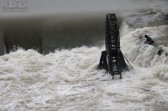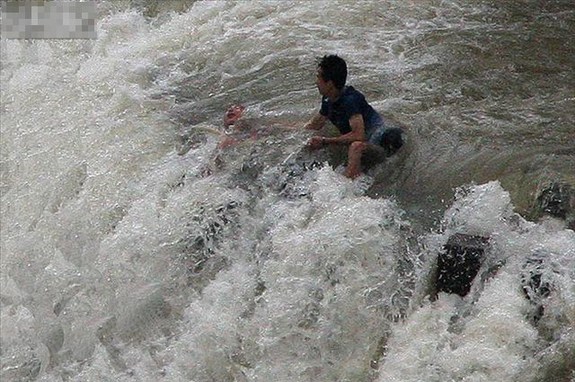 危急時刻,岸邊一餐館老板拿著自來水管,沖入洪流施救,但未能成功。