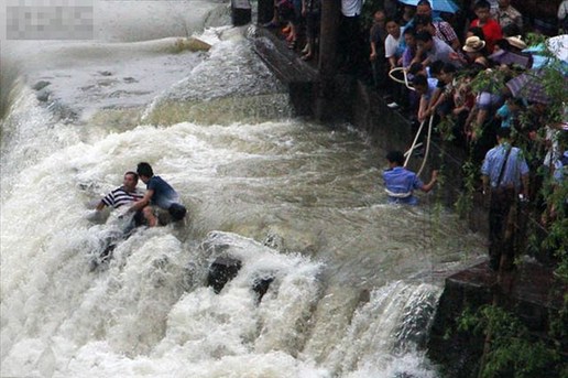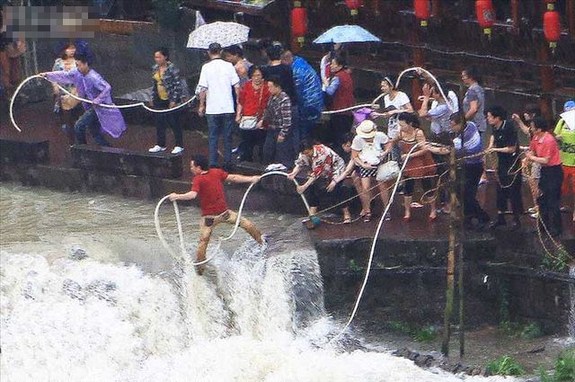 ????5月12日下午,一位武漢65歲游客游覽鳳凰古城時不慎掉入沱江。連日來的暴雨使沱江河水上漲,水流湍急。危急時刻,一名游客和一名當(dāng)?shù)氐貙?dǎo)游跳入洪水中,將老人推上岸。老人獲救后,兩名施救者因力氣耗盡,被困在洪水中,隨時都會被沖到下游。最終,在巡邏民警、餐館服務(wù)人員、游客等眾人的努力下,兩人獲救。