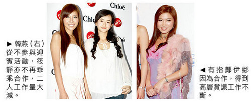 不參與活動(dòng)亞姐與合作亞姐境遇大不同。(左圖)韓燕與筱靜因不參與活動(dòng)工作量大減,而鄭伊娜(右圖)因?yàn)楹献鞯玫礁邔淤p識(shí),真可謂同人不同命。
