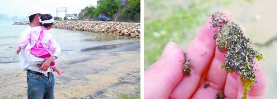 左:三浴海岸出現(xiàn)黑色物質(zhì)。右:這些黑色物質(zhì)呈現(xiàn)顆粒狀