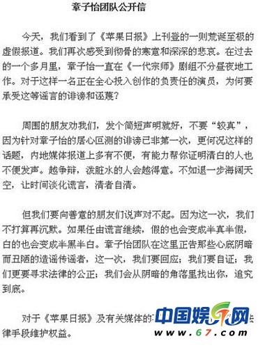 今天,我們看到了《蘋果日報(bào)》上刊登的一則荒誕至極的虛假報(bào)道。我們再次感受到徹骨的寒意和深深的悲哀。在過去的一個(gè)多月里,章子怡一直在《一代宗師》劇組不分晝夜地工作。對于這樣一名正在全心投入創(chuàng)作的負(fù)責(zé)任的演員,為何要承受這等謠言的誹謗和誣蔑?