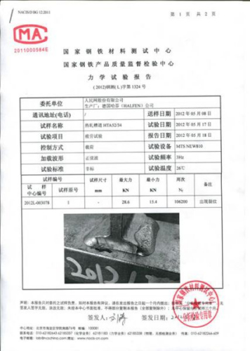 第一份是由中國鐵道科學(xué)研究院金屬及化學(xué)研究所的疲勞檢測報告顯示,標(biāo)有哈芬HTA52/34槽道在經(jīng)過頻率3HZ,載荷大小為22±6.6KN的實驗方法下,該槽道在321826次時發(fā)生裂紋,完全不滿足鐵道部設(shè)計院在設(shè)計標(biāo)準(zhǔn)中50萬次的標(biāo)準(zhǔn)要求,檢測報告說明此槽道疲勞性能完全不合格。
