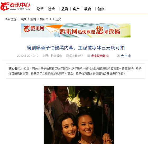 據(jù)黔訊娛樂報(bào)道,有關(guān)于章子怡被官員收作情婦,多年來從中獲利數(shù)億元的消息不脛而走。傳言更稱,章子怡目前已被調(diào)查,故缺席了之前的戛納電影節(jié)。事后,章子怡方面發(fā)布微博和公開信進(jìn)行澄清。