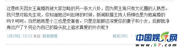 著名的爆料人“八掌柜”,也確認(rèn)了這個(gè)消息,并且還“對(duì)路先生說(shuō)”,“你知道她還叫趙琳的時(shí)候,新聞聯(lián)播主持人楊柳也是為她離婚的嗎?呵呵?!?/p>