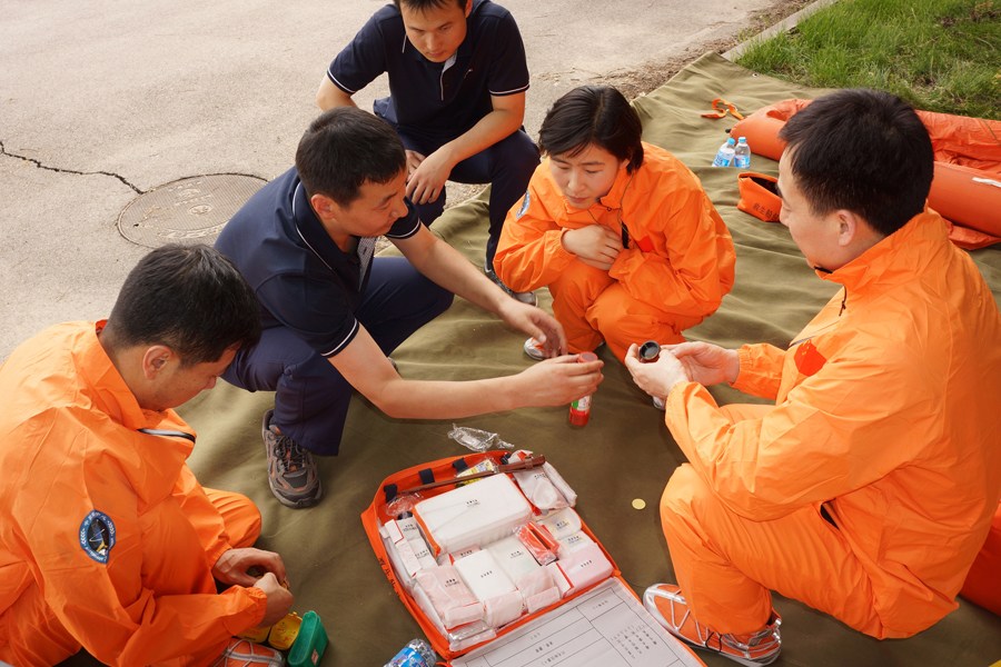航天員教員對執(zhí)行神舟九號飛行任務(wù)的航天員乘組景海鵬、劉旺、劉洋進行野外生存器材使用訓(xùn)練。新華社發(fā)(秦憲安攝)